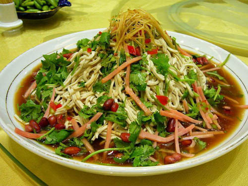 燙干絲:用潔白大干劈成細(xì)絲,用開水燙泡裝盤,然后用芽姜切成細(xì)絲,覆于盤頂,干絲潔白,姜絲金黃,另加一小撮蝦米,澆上黃豆醬油和純香小磨麻油,一經(jīng)拌和,黃白相間,一碟食畢,齒頰留香。