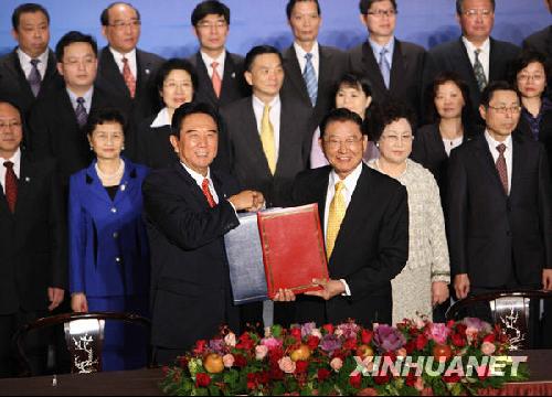 海協(xié)會會長陳云林(前左)與?;鶗麻L江丙坤在交換協(xié)議。新華社記者 袁滿攝 新華網(wǎng)臺中12月23日電(記者劉剛 陳斌華)海協(xié)會和?;鶗?3日在臺中共同舉辦陸資赴臺投資座談會,邀請臺灣有關(guān)部門負責(zé)人、產(chǎn)業(yè)人士介紹陸資赴臺相關(guān)事宜,并與大陸企業(yè)代表交流座談。 海協(xié)會會長陳云林在座談會開始時表示,今天兩岸關(guān)系和平發(fā)展的局面…